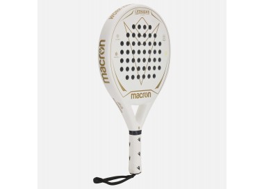 Macron präsentiert den Padelschläger Leonidas Light Powder Racket. Mit seinem modernen Total-White-Design und der Goldgrafik bietet er sich allen regelmäßig aktiven Spielerinnen und Spielern an, die sich einen leistungsfähigen, vom Gewicht her leichteren und somit komfortableren Schläger wünschen. Es handelt sich hierbei um ein Gerät, das neben Leistung eine ausgezeichnete Kontrolle beim Schlag garantiert. Der zu 100% aus Carbonfasern 3K hergestellte und mit einer Kernstruktur aus EVA Ultrasoft Schaum versehene Schläger besticht durch sein extrem leichtes Handling. Die kreisrunde Form erlaubt einen Sweetspot im zentralen Bereich, wo maximale Kontrolle gewährleistet wird. Die Grafik zeigt den Macron Hero in der Mitte, während am Rand der Schriftzug 'Work Hard. Play Harder.', das Motto von Macron, zu erkennen ist. Das Gewicht des Schlägers beträgt 335-355 g.