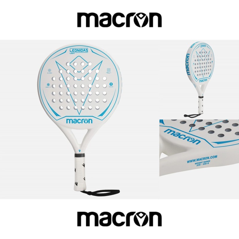 Macron presents the Leonidas Light padel racket. Featuring modern design in shades of light blue and white, it is ideal for regular players who want a high-performance racket, but with a slightly lighter weight for enhanced comfort. This racket delivers serious power along with precision control of the ball. Produced in 100% 3K carbon fibre with an ultra-soft EVA rubber core, it offers players extremely light handling. The round shape provides a central sweet spot to ensure maximum control. The Macron Hero is depicted in the centre, while the edge reads 'Work Hard. Play Harder.', the Macron motto. The racket weighs 335-355 g.