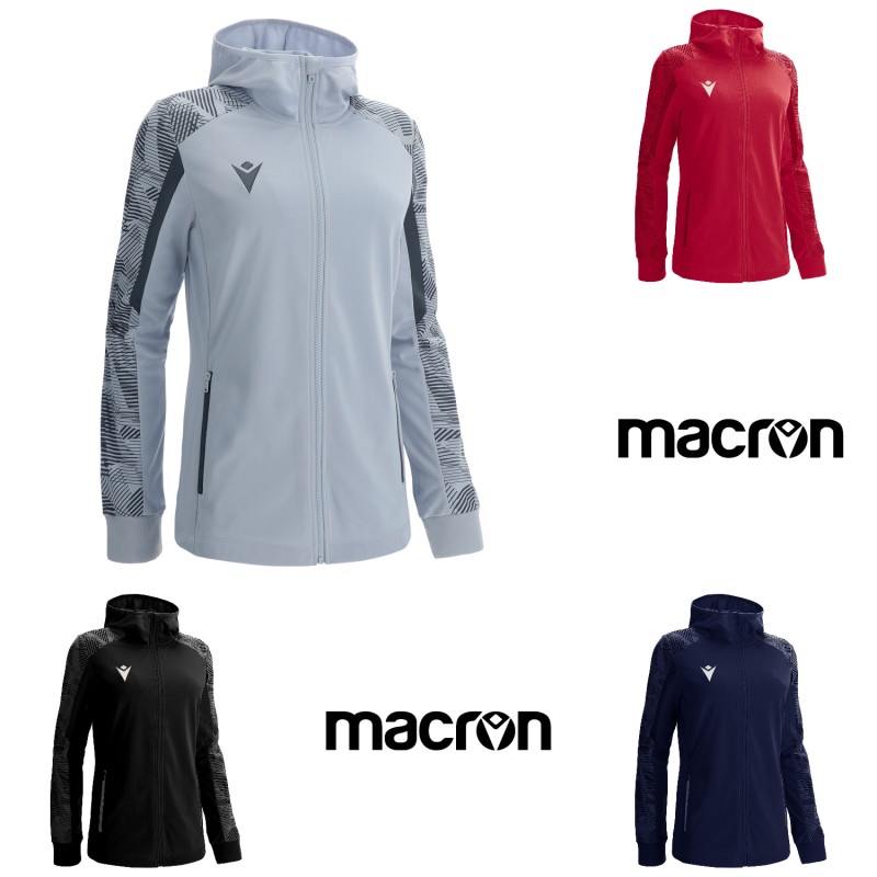 Women's hooded travel top in Polydry fabric. Featuring a full-length die-cast central zip complete with a zip pull with the rubberised Macron Hero. Large side pockets with a reversed nylon zip. Knitted cuffs.