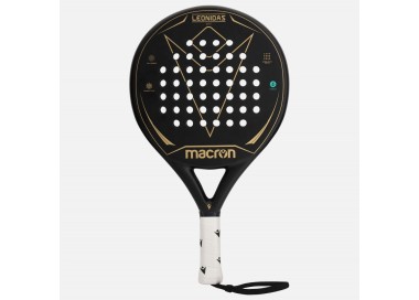 Macron presenta la racchetta padel Leonidas Gold racket. Design moderno total black con la grafica dorata, è stata progettata per il giocatore regolare che desidera avere una racchetta performante. E' una racchetta che garantisce potenza e allo stesso tempo controllo del colpo. Realizzata in 100% fibra di carbonio 3K con nucleo in schiuma EVA compact, permette al giocatore di maneggiarla con estrema leggerezza. La forma rotonda permette di avere uno sweet spot ampio e centrale per garantire massimo controllo. La grafica rappresenta il Macron Hero al centro e sul bordo è presente la scritta 'Work Hard. Play Harder.', motto di Macron. Il peso della racchetta è di 355-375 g.